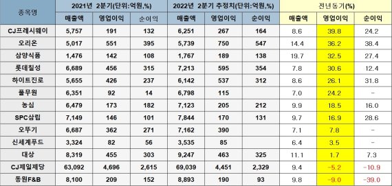 업계 관계자는 "곡물가와 물류비 등 원재료 가격이 지속적인 상승세를 보이며 주요 기업들의 원가 부담이 늘어난 상황"이라며 "지난해 낮은 기저효과로 2분기 양호한 실적이 예상되는 기업들도 3분기에는 실적 악화가 나타날 수 있다"고 전했다.