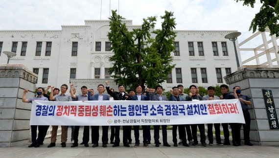 광주·전남경찰직장협의회 회장단은 17일 오후 광주 동구 5·18민주광장에서 공개 기자회견을 열고 "행안부가 경찰을 직접 통제하는 방안으로 산하에 경찰을 지휘 감독하는 '경찰국'을 신설하고, 경찰청이 보유한 경찰 인사와 예산권 감찰권 등 권한 전반을 넘겨 받으려 하고 있다"고 주장했다.