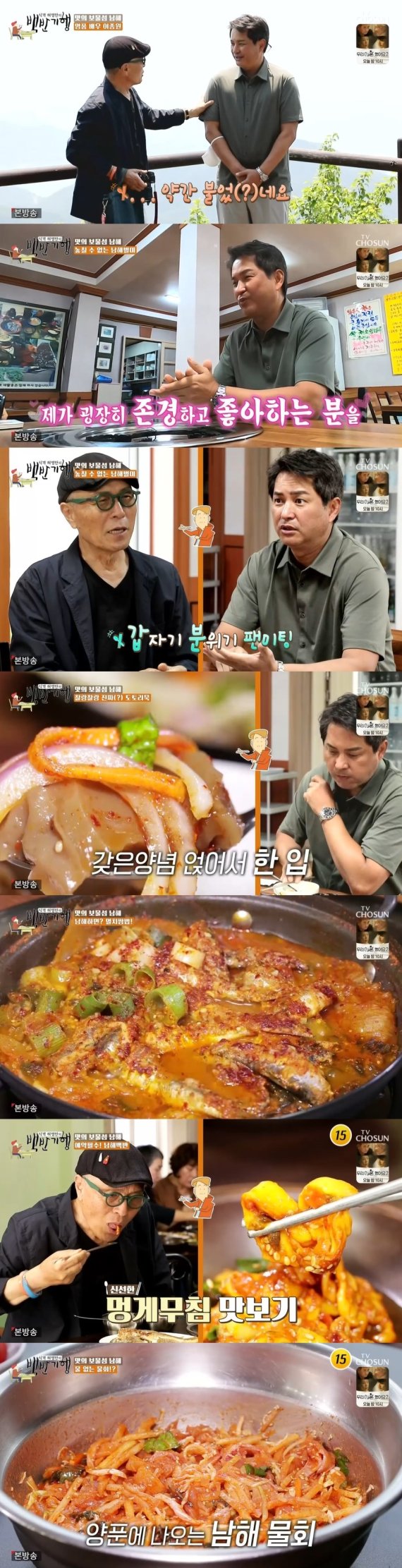 두 사람은 남해에서 멸치쌈밥 맛집, 물회 전문점 등을 방문했다. 먼저 멸치쌈밥집에서 도토리묵을 맛본 이종원은 "기존 먹던 것과는 다른 식감"이라며 "양념장이 적당하고 좋다"라고 호평했다. 허영만 역시 "이 집 좋은 게 양념을 과하게 안 했네"라고 거들었다.