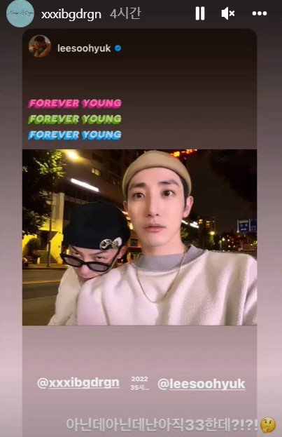 사진에는 지드래곤과 모델 이수혁의 모습이 담겨 있다. 앞서 이수혁이 소셜미디어에 "2022년 35세"라며 지드래곤과 찍은 사진을 올렸고, 이를 지드래곤이 재공유한 것이다.