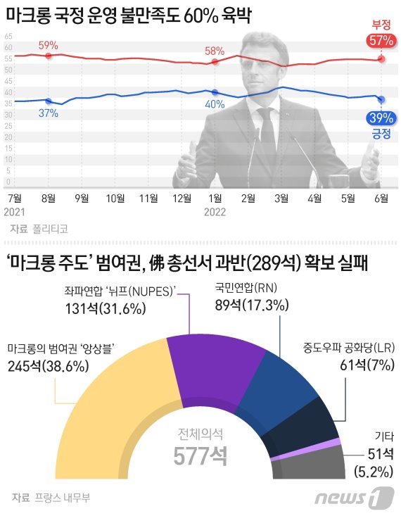 (서울=뉴스1) 정윤영 기자 = 지난 4월 재선에 성공한 에마뉘엘 마크롱 프랑스 대통령이 총선에서 의회를 장악하는데 실패했다.
