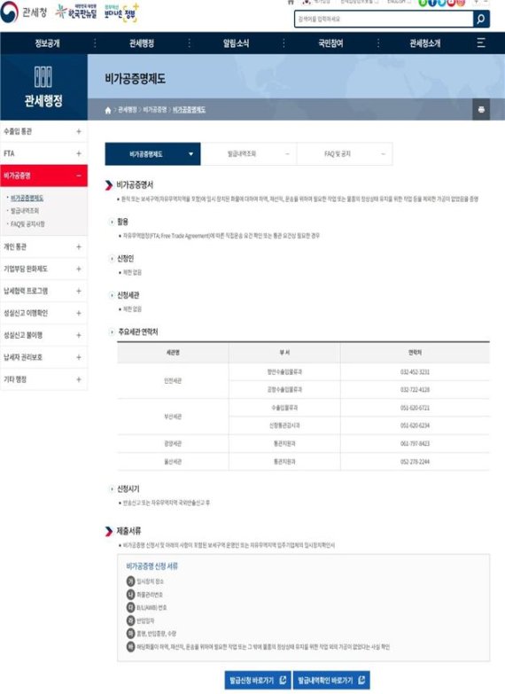 홈페이지는 국문과 영문으로 제공되며, 관세청 홈페이지에서 '관세행정'-'비가공증명’ 순으로 접속하면 된다.