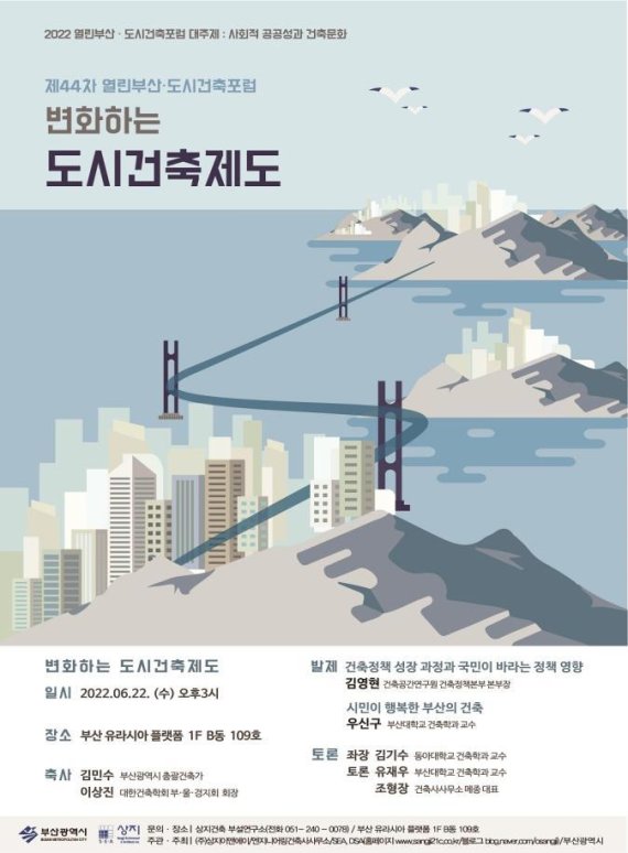 행사에서는 김영현 건축공간연구원 건축정책본부 본부장이 '건축정책 성장 과정과 국민이 바라는 정책 영향'을 주제로, 우신구 부산대학교 건축학과 교수가 '시민이 행복한 부산의 건축' 주제로 발제를 한다.