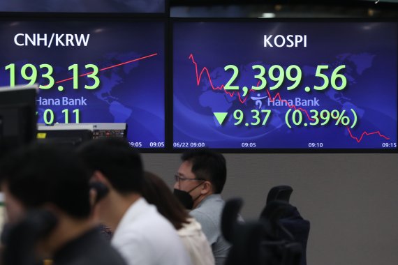 [파이낸셜뉴스] 코스피가 2400선을 회복한 지 하루 만에 또 다시 후퇴했다. 외국인과 기관의 매도세가 거세다. 22일 오전 10시45분 기준 코스피는 전날 대비 33.91p(-1.45%) 하락한 2375.35를 가리키고 있다. 개인은 3933억원 순매수했지만 외국인과 기관이 각각 2282억원, 1756억원 순매도하며 지수가 하락했다. 상승 출발한 코스피는 점차 그 폭을 줄이다가 결국 2400선까지 무너졌다.