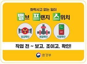 이에 환경부는 화학물질 취급 사업장을 대상으로 작업자가 화학물질 취급 전 밸브, 플랜지(배관과 배관을 연결하는 설비), 스위치의 정상 여부를 반드시 확인하는 '밸프스' 화학안전 홍보활동을 진행한다.