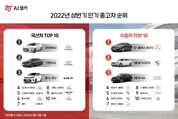 AJ셀카는 28일 2022년 상반기 중고차 시장 인기 모델 순위를 공개했다. '당일 평가' 내차팔기 서비스를 제공하는 AJ셀카가 올해 1월부터 5월까지 온·오프라인 거래 현황을 분석한 결과, 국산차는 '아반떼 AD', 수입차는 '벤츠 E-클래스 W213'의 거래량이 가장 많았다.