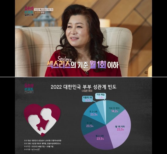본격적인 고민 상담에 앞서 강동우 성의학 연구소, 우리피플즈, '오은영 리포트' 제작진이 공동 참여한 '2022 대한민국 부부 성관계 빈도' 자체 설문조사를 공개했다. 이에 따르면 부부 40.8%가 섹스리스에 해당됐고 이마저도 늘어나는 추세라고 덧붙였다.