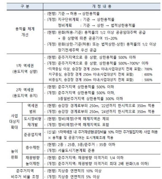 도심·광역중심·지역중심 역세권이고 승강장 경계 250m 이내는 700%까지, 지구중심 역세권이고 승강장 경계 250m 이내는 600%까지, 비 중심지 역세권은 종전대로 승강장 경계 350m까지 500% 내에서 완화된다.