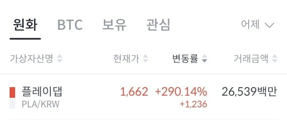 특히 빗썸에서는 암호화폐 플레이댑(PLA)이 전날 대비 300% 넘게 오르는 등 가두리 거래에 따른 시세 변동성이 두드러졌다. 같은 시간 다른 거래소에선 600원대에 거래된 플레이댑이 빗썸에서만 1600원대에 거래되기도 했다.