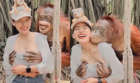 (서울=뉴스1) 소봄이 기자 = 태국 방콕의 한 동물원에서 오랑우탄이 여성 관광객의 가슴을 움켜쥐고 뽀뽀를 퍼붓는 모습이 포착돼 화제다.