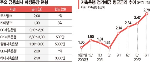 저금리 기조가 풀리면서 저축은행 평균 예금금리는 2년 전 연 1.5~2.0% 수준에서 현재 2.0~2.5%까지 올랐다. 증시 변동성이 커지고 부동산 시장이 얼어붙으면서 투자처를 잃은 돈들이 파킹통장으로 모이고 있다는 것이 업계의 해석이다.