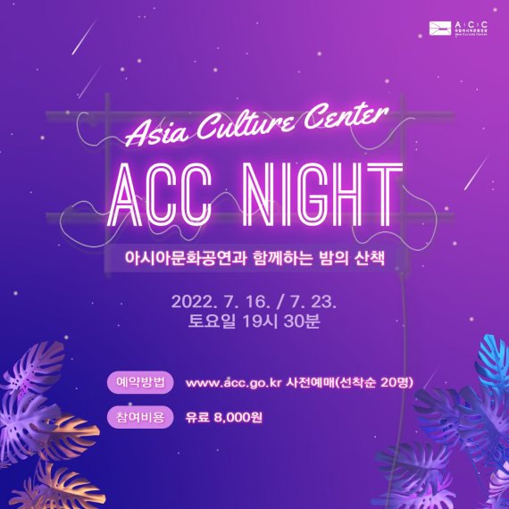 달빛 아래 ACC를 거닐며 여름밤의 낭만을 느낄 수 있는 'ACC 나잇'은 유료(8000원)로 진행된다. 예약 신청은 오는 8일부터 ACC 누리집에서 가능하다.