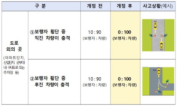 이에 따라 협회는 아파트 단지 등 도로 외의 곳에서 보행자 사고 발생시 차량 과실을 기본적으로 100%로 과실비율을 조정했다.