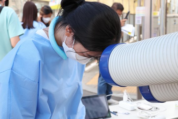 6일 서울 중구보건소 선별진료소에서 의료진이 냉풍기로 더위를 식히고 있다. 사진=박범준 기자