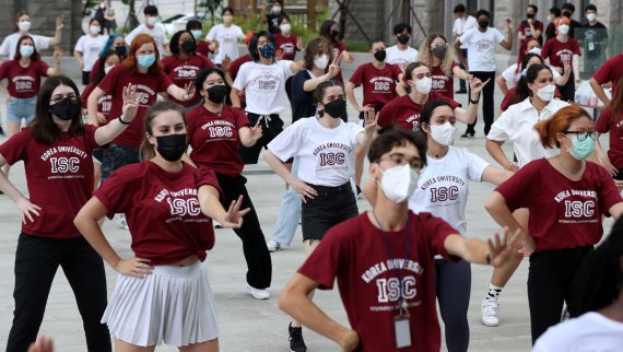 [서울=뉴시스] 추상철 기자 = 고려대 국제하계대학(ISC)에 참가한 외국인 대학생들이 8일 오후 서울 성북구 고려대학교에서 '싸이의 That That(댓댓)' 음악에 맞춰 플래시몹을 선보이고 있다. 2022.07.08. scchoo@newsis.com [서울=뉴시스] 류현주 기자 = 외국인 대학생들이 8일 서울 성북구 고려대학교 SK미래관 하나플라자에서 대규모 플래시몹을 선보였다.