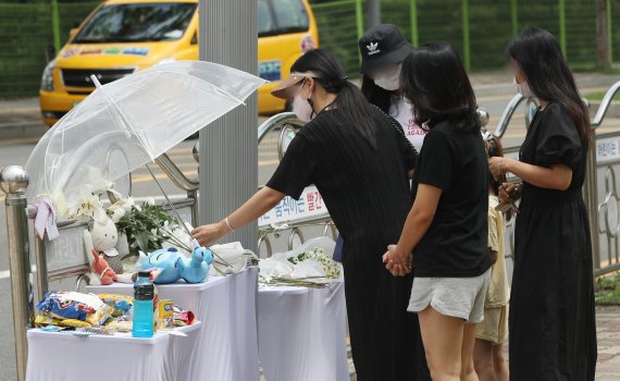 국화꽃을 놓으며 잠시나마 묵념하는 시민들, 정문 앞에 다다르기 이전부터 눈물을 흘리는 시민들 등 정문 앞은 숨진 11세 학생을 추모하기 위한 발걸음으로 끊이질 않았다.