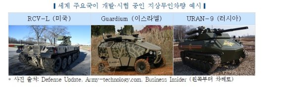 지상무인차량의 높은 장점에 따라 세계 주요국이 수송·전투·정찰 등에 특화된 군용 지상무인 차량을 앞다퉈 개발 중이다.