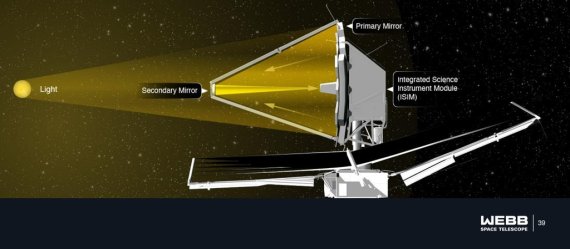 우선 관측 대상의 빛을 모으는 역할을 하는 주경의 지름은 6.5m다. 주경의 크기는 망원경의 감도와 직결되는데 허블과 스피처 망원경은 각각 2.4m, 0.85m다.