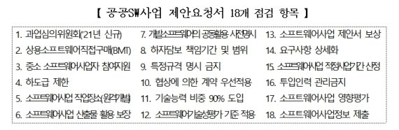 또한 '공공SW사업 제안요청서 작성 예시'에는 공공 발주자가 제안요청서에 SW 법·제도 18 항목 반영 여부를 자체 점검할 수 있는 'SW사업 법제도 항목 반영 자가 점검표'를 추가했다.