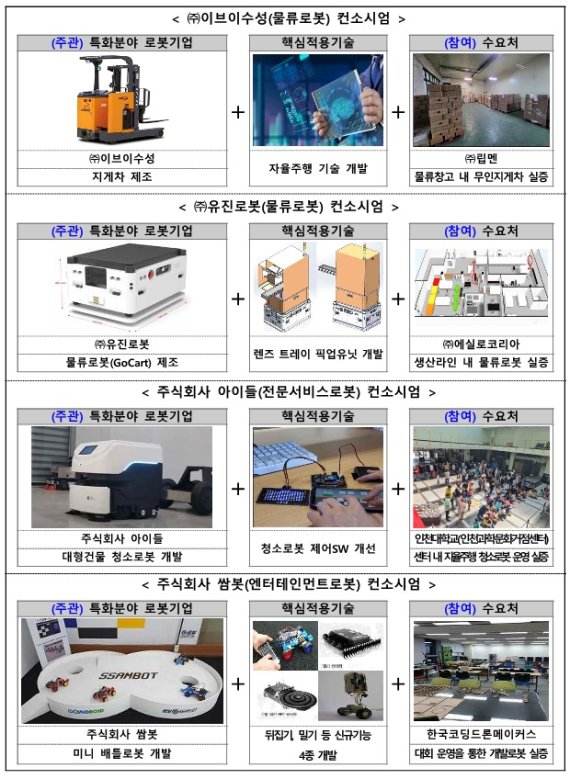 이 사업은 인천지역의 산업 특성과 강점을 살린 물류·전문서비스·엔터테인먼트로봇의 서비스 모델을 발굴해 제품화부터 실증, 사업화까지 단계별로 지원하는 사업이다.