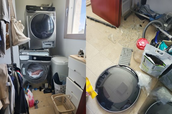 A씨가 글과 함께 올린 사진에는 다용도실 안 세탁기와 그 위에 올려진 건조기 모습이 담겼다. 세탁기는 문이 떨어져 나가 있으며 유리 파편들도 보인다.