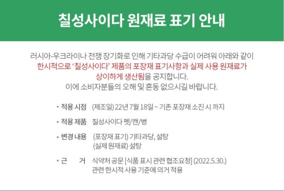 롯데칠성음료는 칠성사이다 페트, 캔, 병 제품의 포장재 표기사항과 실제 사용 원재료가 상이하게 생산될 예정이라고 공지하며 기타 과당 수급이 정상화될 때까지 기타과당을 사용하지 않고 설탕 만으로 제품을 생산한다고 전했다.