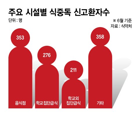 한편 6월 식중독 발생 중 최다 신고 장소는 어린이집, 학교 등 집단급식소(26건, 487명)로 집계됐다. 그뒤를 이어 음식점(20건 353명), 지역행사 등 기타장소(7건 358명) 순으로 조사됐다. 식약처는 "코로나19 재유행 위험과 함께 식중독이 늘면서 식품안전관리에 대한 국민들의 우려가 증대하고 있다"면서 "발생건수가 많은 집단급식소나 위생취약 음식점의 위생점검을 강화할 것"이라고 밝혔다.