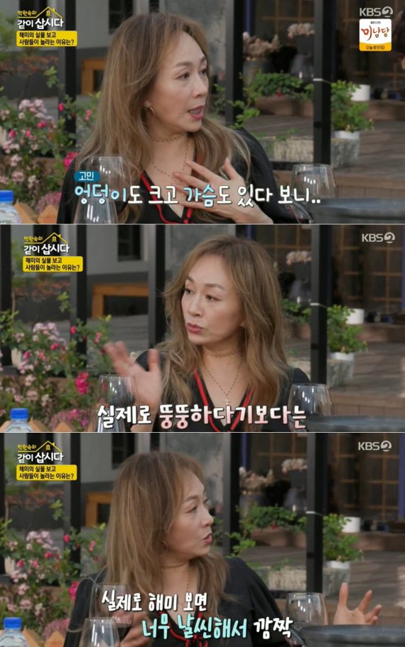 하지만 박해미는 "제가 힙도 크고 가슴이 있다 보니 옷태가 안 난다"며 "일상적으로 다닐 때는 뚱뚱하다는 이야기를 하는 사람이 없는데 방송은 아니더라. 실제로 본 분들은 날씬하다고 말해준다"라고 밝혔다.