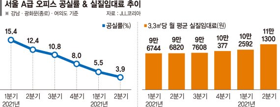 20일 글로벌 부동산 서비스 회사인 존스랑라살(JLL)코리아가 발행한 '2022년 2분기 서울 A급 오피스 시장 동향' 보고서에 따르면 올해 2·4분기 서울 강남·여의도·광화문(종로) 등 주요 지역 A급 오피스의 공실률은 3.9%로, 2009년 3·4분기(3.3%) 이후 최저 수준으로 조사됐다. 2·4분기 서울 A급 오피스 공실률은 직전 분기의 5.5% 대비 1.6%p 낮아진 수준으로, 자연 공실률(5%)보다 낮은 공실률을 기록했다.
