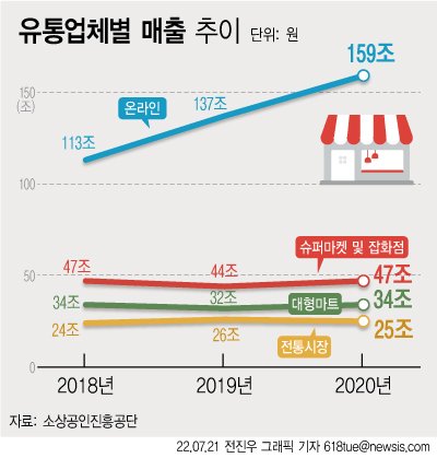 통계청에 따르면 영업제한이 시작된 2012년부터 대형마트의 매출은 10년 연속 역성장하고 있다. 반면 온라인 유통시장 매출은 갈수록 성장세다.