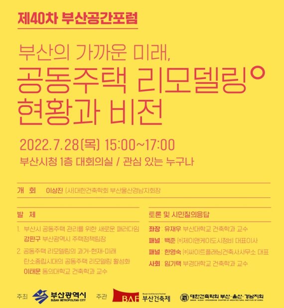포럼 주제발표는 ▲부산시 공동주택 관리를 위한 새로운 패러다임(강판구 부산시 주택정책팀장) ▲탄소중립시대의 공동주택 리모델링 활성화(이태문 동의대 건축학과 교수) 순으로 진행될 예정이다.