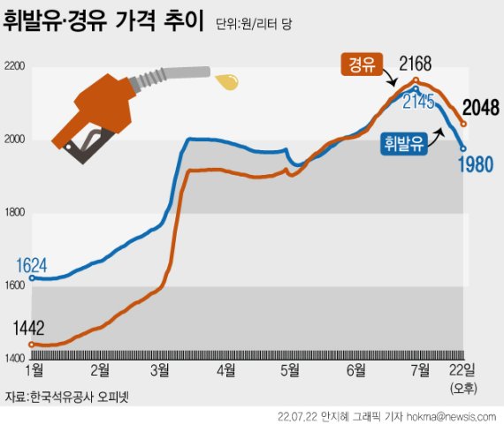 휘발유 가격은 지난 5월26일 2000원대(2002원)를 돌파한 후 6월3일 2020원대, 6일 2030원대, 8일 2040원대, 10일 2050원대를 넘어서는 등 계속 올랐다. 지난달 11일에는 2064.59원을 기록, 10년 2개월 만에 역대 최고가 기록(2012년 4월 18일 2062.55원)을 갈아치웠다.