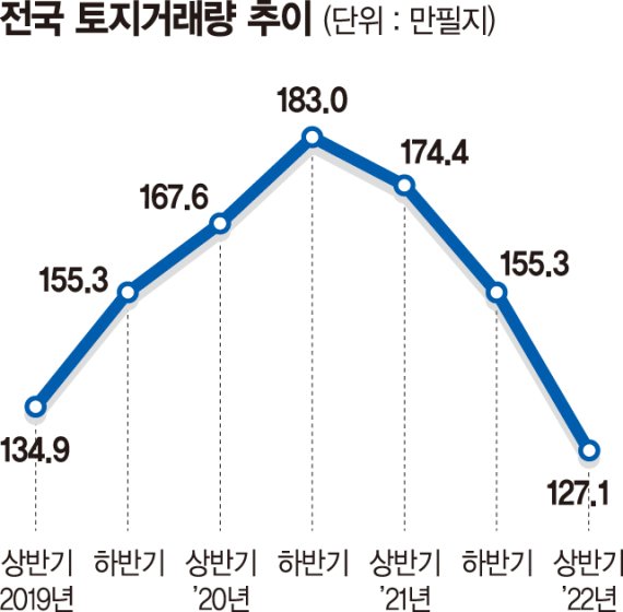 지난 2019년부터 2020년까지 꾸준히 늘던 토지 거래량은 2021년에 상반기 174만400필지(-4.7%), 하반기 155만3000필지(-10.9%) 등 감소세를 이어갔다. 특히 올해 상반기는 감소폭이 20%에 육박했다.