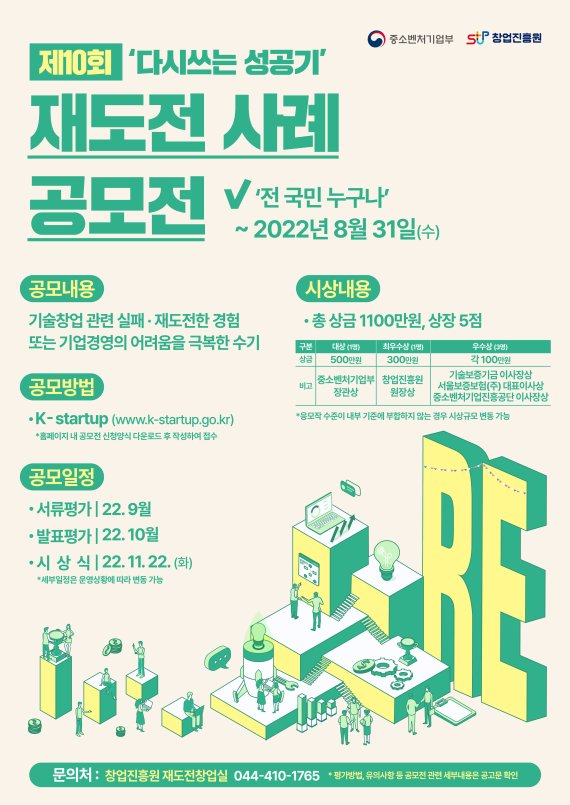 26일 중기부에 따르면 10회째인 재도전 사례 공모전은 창업 후 어려움을 겪고 다시 재도전하기까지 고군분투한 기업인들의 스토리를 공유한다.