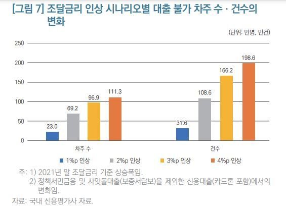 김 연구위원은 "조달금리 인상에 따라 2금융권에서 배제되는 차주들이 정책금융, 대부업, 비제도권 금융시장으로 편입되지 못하고 롤오버가 제약되면 최대 35조3000억원의 연체가 발생할 수 있다"고 예상했다.