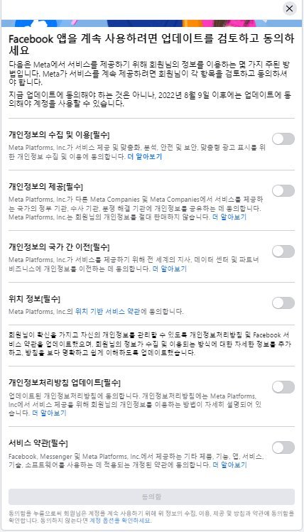 페이스북과 인스타그램 운영사 메타가 서비스 이용 조건으로 △개인정보 수집 및 이용 △개인정보 제공 △개인정보의 국가 간 이전 △위치 정보 △개인정보 처리 방침 업데이트 △서비스 약관 등 6개 항목에 동의하라고 공지했기 때문이다.