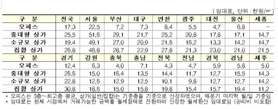 소규모 상가는 공실률이 9.3%로 전 분기 대비 1.1%p, 임대료는 ㎡당 2만900원으로 0.06%p 증가했지만 중대형 상가 공실률은 14.2%로 0.1%p, 임대료는 2만1700원으로 0.10%p 각각 감소했다.