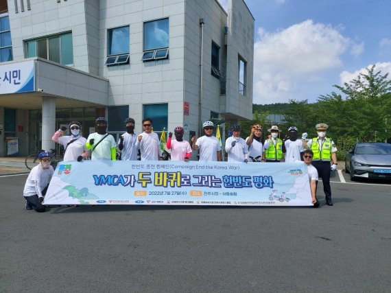 이날 발대식에서 한반도 평화선언문 낭독과 한반도 종전 캠페인 슬로건을 외치고 진주시청에서 출발, 하동 송림까지 한반도 종전 진주YMCA 자전거 평화단이 53.3㎞를 달렸다.