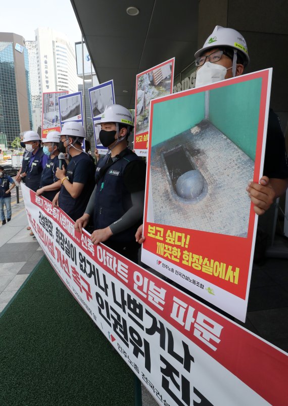 건설노조가 수도권에 있는 LH 건설현장 23곳을 조사한 결과, 건설현장 1곳당 평균 172명이 일했지만 화장실은 2.5개에 불과했다. 이마저도 화장실 위생 상태가 불량한 곳이 약 35%에 달한 것으로 드러났다.