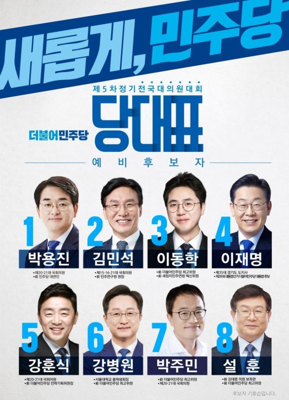 현재 당 대표 선거 예비후보로는 박용진, 김민석, 이동학 전 최고위원, 이재명, 강훈식, 강병원, 박주민, 설훈 의원(이상 기호순)이 등록된 상황이다.