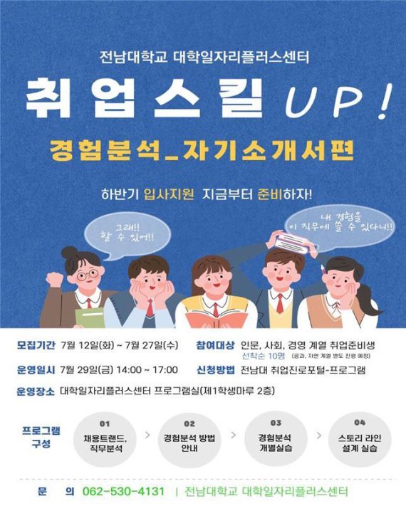 (광주=뉴스1) 박준배 기자 = 전남대학교 대학일자리플러스센터는 29일과 8월5일 두 차례에 걸쳐 취업준비생들의 입사 지원을 돕기 위한 '취업 스킬-업(UP) 경험 분석 자기소개서편' 프로그램을 운영한다.
