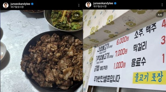 이 대표는 이날 오후 인스타그램에 "칠성시장 단골식당에서 점심 잘먹고 갑니다. 음식값을 안 받으시다니…"라고 적은 뒤 간장불고기 사진과 깨끗이 비운 그릇 사진 등을 게시했다. 위치 등록에는 '대구 칠성시장'을 노출했다.