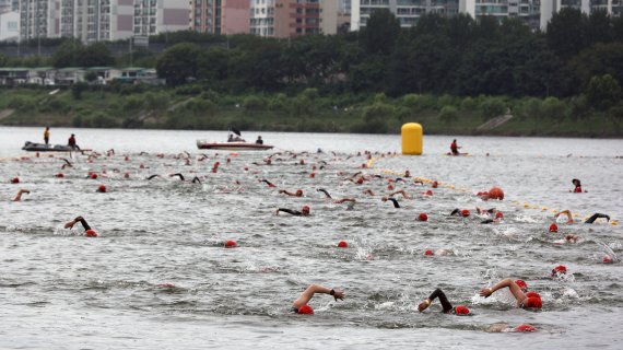 31일 서울 송파구 잠실 한강공원 일대에서 열린 서울특별시 철인3종협회장배 아쿠아슬론 대회에서 참가자들이 역영하고 있다. 사진=서동일 기자