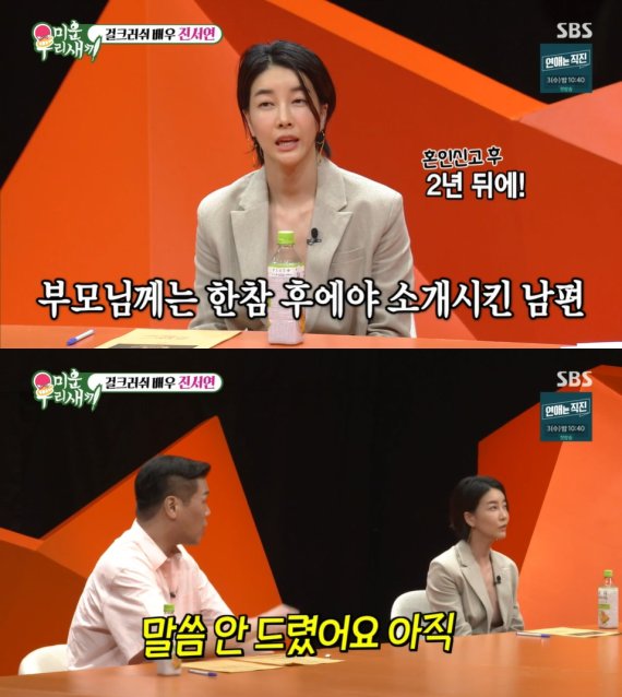 그런데 부모님에게 소개한 건 혼인신고 2년 후였다고. 진서연은 "정리정돈을 시킨 후에 소개를 해야 허락을 받을 것 같았다. 혼인신고 당시 보여드렸다면 난리가 났을 것이다"고 했다. 서장훈은 부모님이 혼인신고하고 소개했다는 걸 알았다면 놀랐을 것 같다고 하자, 진서연은 "말씀 안 드렸다. 이거 보시면 알 것이다"고 말해 충격을 줬다. 허경환의 어머니는 "결혼한 지 10년 지났으면 유효기간 지났다"고 너스레를 떨었다.