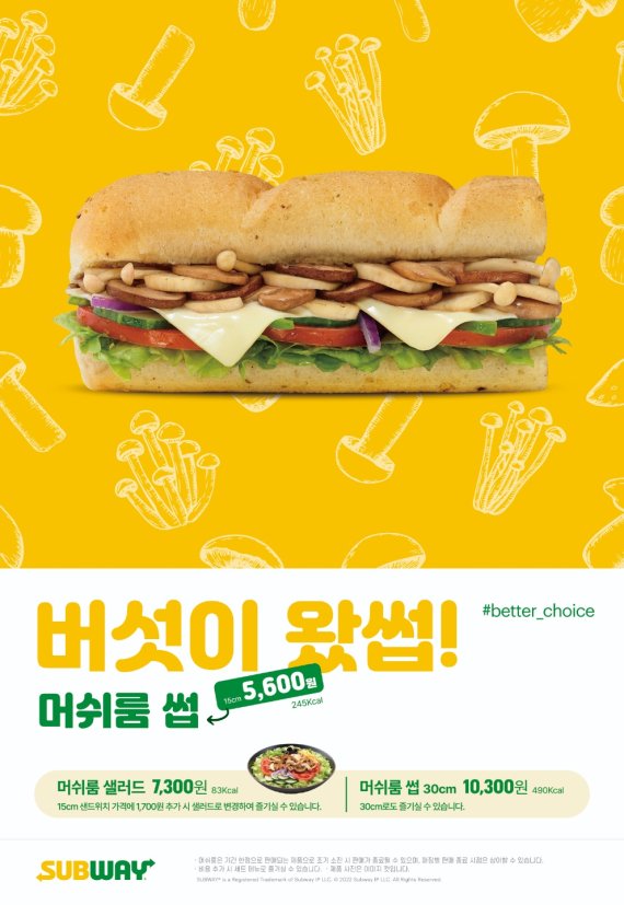 가격은 15cm 샌드위치 기준 머쉬룸썹 5600원, 머쉬룸썹 샐러드 7300원이다.
