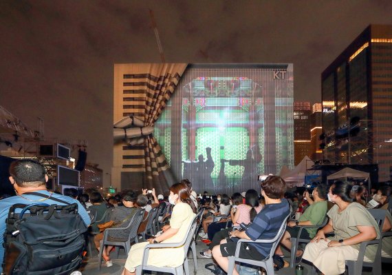 KT는 지난 6일 개최된 광화문광장 개장 기념행사 '광화문광장 빛모락(樂)'에서 리모델링 공사 중인 KT 광화문West 사옥 가림막을 활용한 미디어파사드 공연을 진행했다고 7일 밝혔다.