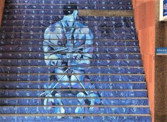 작성자 A씨는 "복지관에서 경영관 올라가는 계단에 이렇게 돼 있는데 "허가받고 붙인 것이냐"며 "그림이 아니라 스티커를 붙인 것 같다. 더러운데 왜 있는 거냐"고 비난했다.