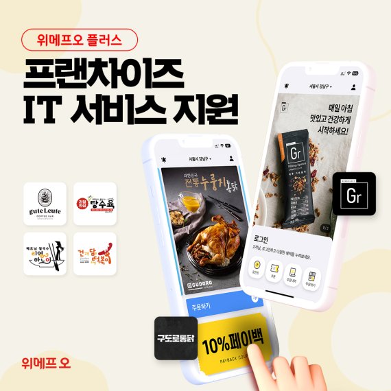 지난해 11월 서비스 이후 '위메프오 플러스'를 활용해 스쿨푸드, 얌샘김밥, 혼밥대왕 등 20여 곳의 프랜차이즈가 자사앱을 출시했다. 배달과 픽업 서비스를 비롯해 자사앱으로 확보한 고객 DB를 바탕으로 마케팅 활동도 지원한다.