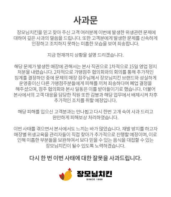 이에 장모님치킨 본사 측은 홈페이지에 ‘사과문’을 게시하고 “해당 매장에 본사 직권으로 1차적으로 15일 영업정지 처분을 내렸다”며 “2차적으로 가맹점주 협의회와의 회의를 통해 추가적인 징계를 결정하던 중에 문제의 매장 점주가 장모님치킨 브랜드와 성실하게 운영 중이던 다른 가맹점주들에게 피해를 끼쳐 죄송하다며 폐업 결정을 해줬고 점주 협의회와 본사는 이를 받아들이기로 했다. 본사에서의 고객 대응을 담당한 직원 또한 감봉과 해당 업무에서 배제시켜 차후 추가적인 조치를 취할 예정”이라고 해명했다.