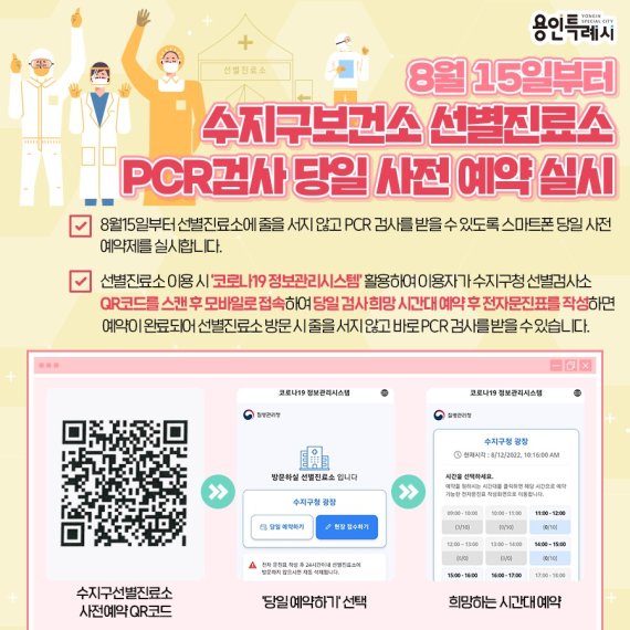 수지구 선별진료소(수지구청 광장) 사전 예약 QR코드를 입력하거나 코로나19 정보관리시스템에 접속해 '당일 예약' 버튼을 눌러 검사 희망 시간을 지정한 후 전자문진표를 제출하면 된다.